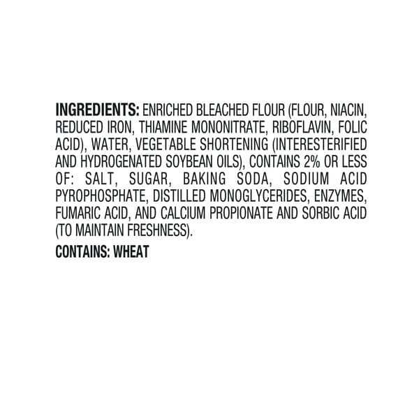 Enriched Bleached Flour (flour, Niacin, Reduced Iron, Thiamine Mononitrate, Riboflavin, Folic Acid), Water, Vegetable Shortening (interesterified And Hydrogenated Soybean Oils), Contains 2% Or Less Of: Salt, Sugar, Baking Soda, Sodium Acid Pyrophosphate, Distilled Monoglycerides, Fumaric Acid, And Calcium Propionate And Sorbic Acid (to Maintain Freshness)