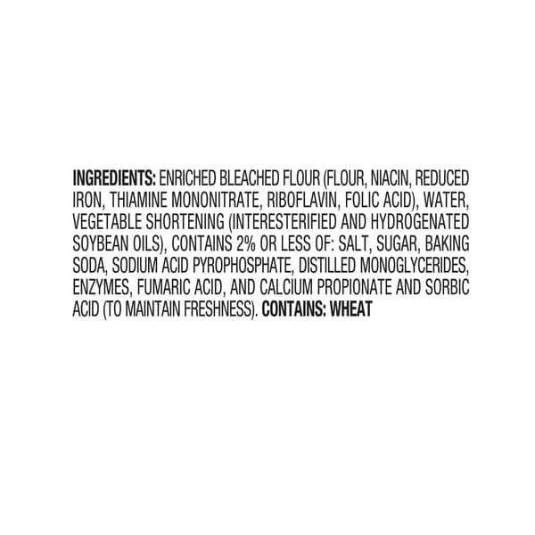 Enriched Bleached Flour (flour, Niacin, Reduced Iron, Thiamine Mononitrate, Riboflavin, Folic Acid), Water, Vegetable Shortening (interesterified And Hydrogenated Soybean Oils), Contains 2% Or Less Of: Salt, Sugar, Baking Soda, Sodium Acid Pyrophosphate, Distilled Monoglycerides, Fumaric Acid, And Calcium Propionate And Sorbic Acid (to Maintain Freshness)