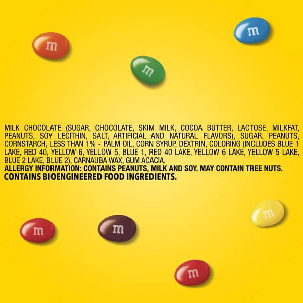 Milk Chocolate (sugar, Chocolate, Skim Milk, Cocoa Butter, Lactose, Milkfat, Peanuts, Soy Lecithin, Salt, Artificial And Natural Flavors), Sugar, Peanuts, Cornstarch, Less Than 1% – Palm Oil, Corn Syrup, Dextrin, Coloring (includes Blue 1 Lake, Red 40, Yellow 6, Yellow 5, Blue 1, Red 40 Lake, Yellow 6 Lake, Yellow 5 Lake, Blue 2 Lake, Blue 2), Carnauba Wax, Gum Acacia.