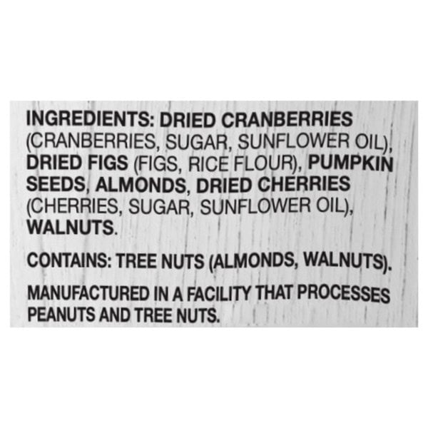 Dried Cranberries (cranberries, Sugar, Sunflower Oil), Dried Figs (figs, Rice Flour), Pumpkin Seeds, Almonds, Dried Cherries (cherries, Sugar, Sunflower Oil), Walnuts.