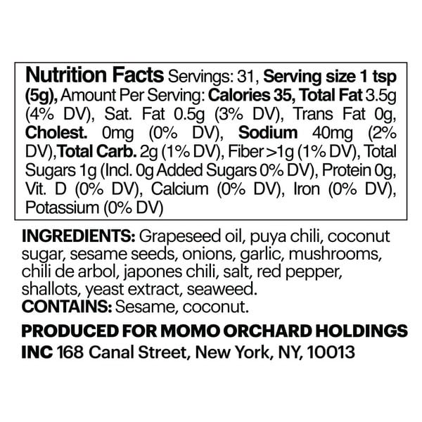 grapeseed oil, puya chilis, coconut sugar, onions, garlic, sesame seeds, japones chilis, chilis de arbol, mushroom powder, salt, shallots, spices, yeast extract, seaweed