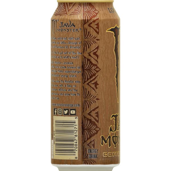 Monster Energy Blend: glucose, taurine, panax ginseng extract, caffeine, glucuronolactone, guarana extract, inositol, l-carnitine, maltodextrin. Caffeine from All Sources: 100 mg per 8 fl oz serving (188 mg per can). No foam, extra hot, half-caf, no-whip, soy latte – Enough of the coffeehouse BS already! It’s time to get out of the line and step up to what’s next! Java Monster – premium coffee and cream brewed up with killer flavor, supercharged with Monster energy blend. Coffee done the Monster way, wide open, with a take no prisoners attitude and the experience and know-how to back it up. www.monsterenergy.com. Facebook. Instagram. Twitter. YouTube.