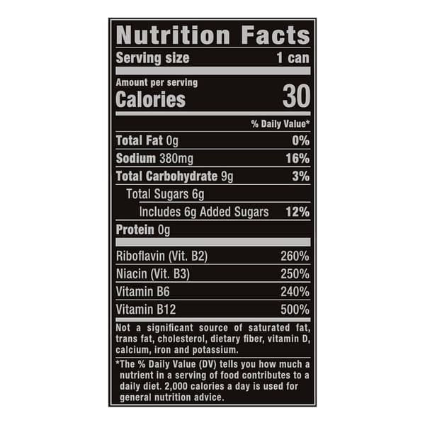 Carbonated Water, Glucose, Citric Acid, Natural Flavors, Taurine, Sodium Citrate, Color Added, Panax Ginseng Extract, Caffeine, Sorbic Acid (preservative), Sucralose, Benzoic Acid (preservative), L-carnitine L-tartrate, Niacinamide (vit. B3), Acesulfame Potassium, Salt, D-glucuronolactone, Inositol, Guarana Extract, Pyridoxine Hydrochloride (vit. B6), Riboflavin (vit. B2), Maltodextrin, Cyanocobalamin (vit. B12).