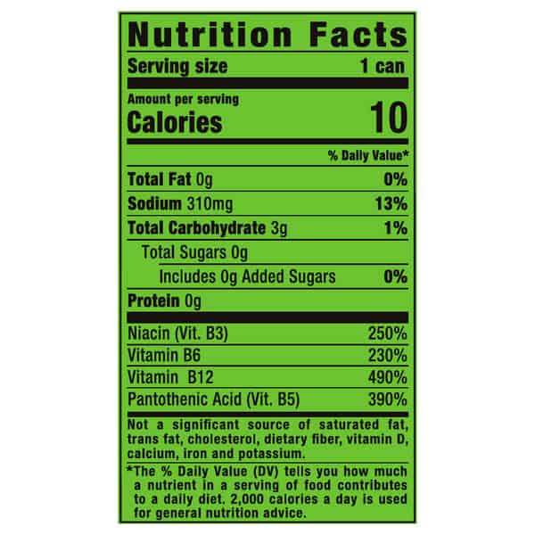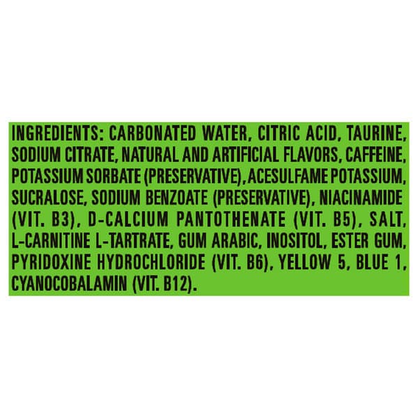Carbonated Water, Citric Acid, Taurine, Sodium Citrate, Potassium Sorbate (preservative), Caffeine, Acesulfame Potassium, Sucralose, Sodium Benzoate (preservative). Niacinamide (vit. B3), D-calcium Pantothenate (vit. B5), Salt, L-carnitine L-tartrate, Natural & Artificial Flavors, Gum Arabic, Inositol, Ester Gum, Pyridoxine Hydrochloride (vit. B6), Yellow #5, Blue #1, Cyanocobalamin (vit. B12).