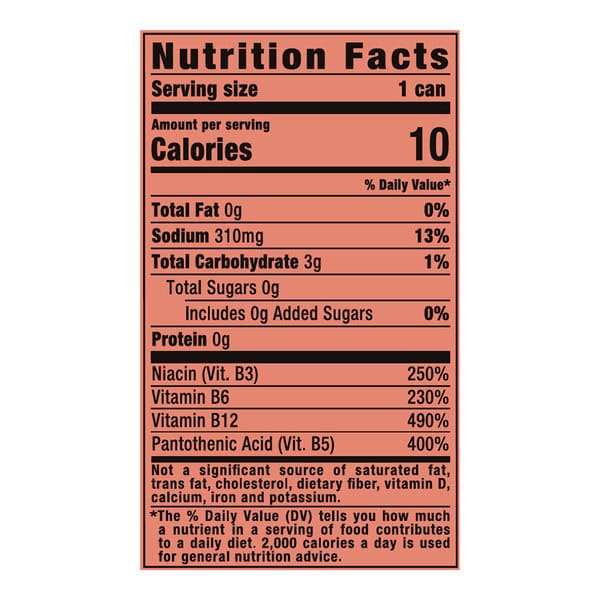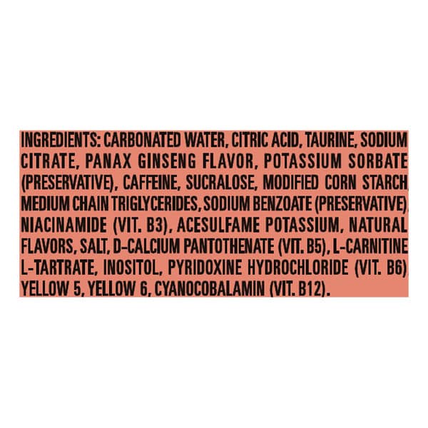 Carbonated Water, Citric Acid, Taurine, Sodium Citrate, Panax Ginseng Flavor, Potassium Sorbate (preservative), Caffeine, Sucralose, Modified Corn Starch, Medium Chain Triglycerides, Sodium Benzoate (preservative), Niacinamide (vit. B3), Acesulfame Potassium, Natural Flavors, Salt, D-calcium Pantothenate (vit. B5), L-carnitine L-tartrate, Inositol, Pyridoxine Hydrochloride (vit. B6), Yellow 5, Yellow 6, Cyanocobalamin (vit. B12)