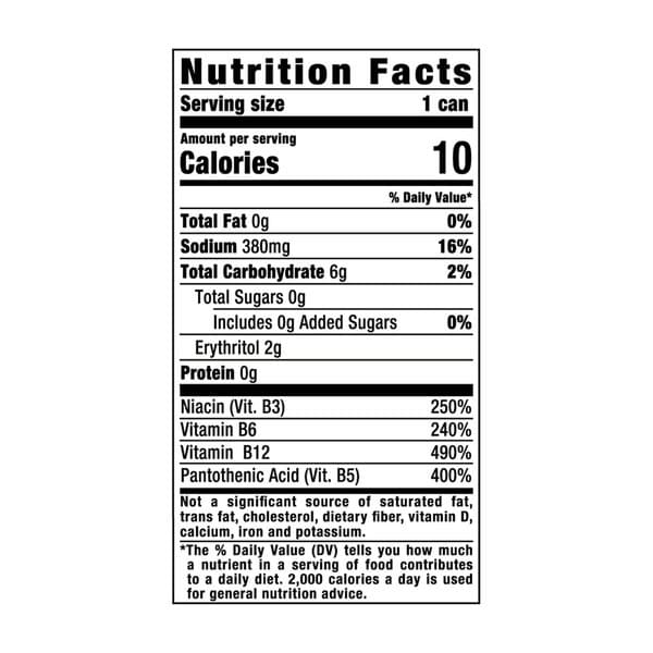 Carbonated Water, Citric Acid, Erythritol, Taurine, Sodium Citrate, Natural & Artificial Flavors, Panax Ginseng Flavor, L-carnitine L-tartrate, Caffeine, Sucralose, Sorbic Acid (preservative), Benzoic Acid (preservative), Niacinamide (vit. B3), D-calcium Pantothenate (vit. B5), Acesulfame Potassium, Inositol, Pyridoxine Hydrochloride (vit. B6), Cyanocobalamin (vit. B12)