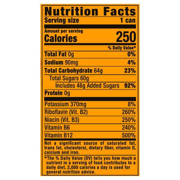 Carbonated Water, Sugar, Guava Puree, White Grape Juice Concentrate, Mango Puree, Glucose, Apple Juice Concentrate, Citric Acid, Taurine, Pineapple Syrup, Pineapple Juice Concentrate, Potassium Citrate, Natural Flavors, Lemon Pulp, Apricot Puree, Orange Juice Concentrate, Peach Puree, Sodium Citrate, Potassium Sorbate (preservative), Caffeine, Niacinamide (vit. B3), L-carnitine L-tartrate, Sucralose, Xanthan Gum, Sodium Alginate, Passionfruit Juice Concentrate, Inositol, Gum Arabic, Sodium Benzoate (preservative), Pyridoxine Hydrochloride (vit. B6), Riboflavin (vit. B2), Ester Gum, Salt, Red #40, Cyanocobalamin (vit. B12).