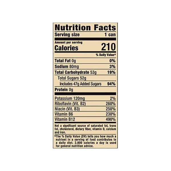 Carbonated Water, Sugar, Glucose, Orange Juice Concentrate, Apple Juice Concentrate, Taurine, Citric Acid, Raspberry Juice Concentrate, Guava Puree, Cherry Juice Concentrate, Sodium Citrate, Potassium Sorbate (preservative), Caffeine, Sodium Benzoate (preservative), Natural Flavors, Niacinamide (vit. B3), Sucralose, Pineapple Juice Concentrate, Passionfruit Juice Concentrate, Gum Arabic, Red #40, Salt, Ester Gum, Inositol, L-carnitine L-tartrate, Pyridoxine Hydrochloride (vit. B6), Riboflavin (vit. B2), Blue #1, Cyanocobalamin (vit. B12)