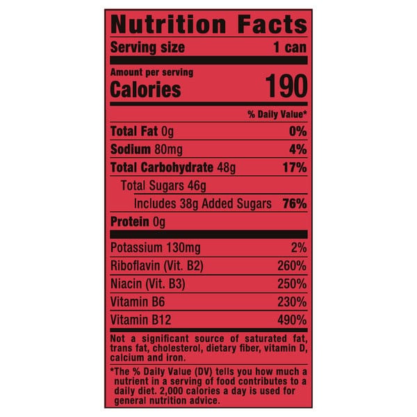 Carbonated Water, Sugar, Glucose, Apple Juice Concentrate, Orange Juice Concentrate, Taurine, Citric Acid, Guava Puree, Panax Ginseng Extract, Sodium Citrate, Potassium Sorbate (preservative), Caffeine, Gum Arabic, Maltodextrin, Sodium Benzoate (preservative), Sucralose, Natural Flavors, Pineapple Juice Concentrate, Passionfruit Juice Concentrate, Niacinamide (vit. B3). Ester Gum, L-carnitine L-tartrate, Salt, Inositol, D-glucuronolactone, Guarana Extract, Pyridoxine Hydrochloride (vit. B6), Riboflavin (vit. B2), Red #40, Cyanocobalamin (vit. B12).