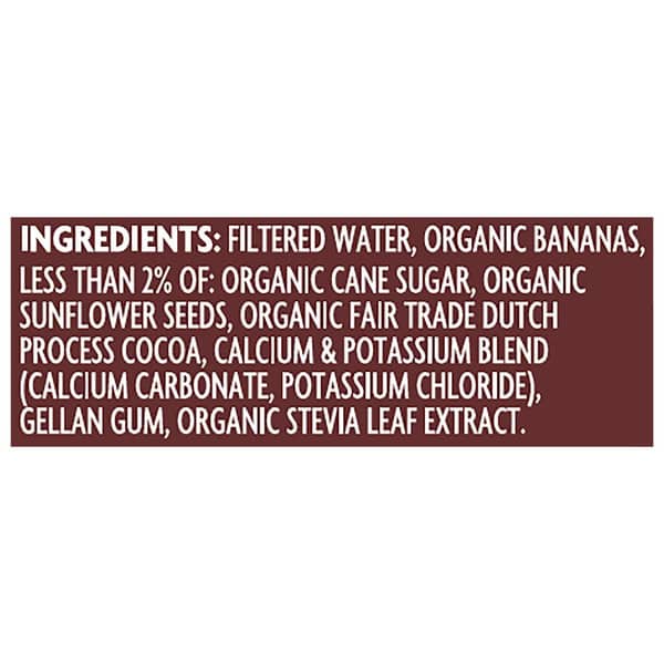 Filtered Water, Organic Bananas, Less Than 2% Of: Organic Cane Sugar, Organic Sunflower Seeds, Organic Fair Trade Dutch Process Cocoa, Calcium & Potassium Blend (calcium Carbonate, Potassium Chloride), Gellan Gum, Organic Stevia Leaf Extract