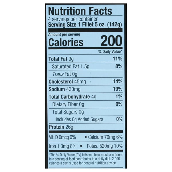 Cooking Instructions: • For Food Safety, Quality, And Thorough Cooking, Please Follow The Instructions Below. • Keep Frozen Until Ready To Prepare. Fish Can Be Prepared From Thawed Or Frozen, The Preferred Method Is From Thawed. To Thaw, Refrigerate In Pouch Overnight. To Quick Thaw, Place Pouch In Cold Water For 20 To 30 Minutes. Cook Fish Immediately After Thawing. • Product Is Not Ready To Eat Until Fully Cooked To An Internal Temperature Of 145°F. Fish Thickness May Affect Cooking Time. * Microwaving Not Recommended. • Product Has Been Deboned, But As With All Fish, There Is The Potential To Find Small Bones. Due To Differences In Appliances, Cooking Times May Vary And Require Adjustment. • Caution-Product Will Be Hot! Conventional Oven: • Preheat Oven To 375°F. • Remove Fillet(S) From Pouch And Place In A Single Layer, Not Touching, With Flat Side Down On A Foil-Lined Sided Baking Pan. • Place Baking Pan On Middle Rack Of Oven. • From Thawed: Bake For 15 – 17 Minutes (1 Or 2 Fillets). • From Frozen: Bake For 28 – 30 Minutes (1 Or 2 Fillets). Grill: • Spray Aluminum Foil Lightly With Cooking Oil, Then Place On Grill. • Preheat Grill To Medium-High (350°F – 375°F). • Remove Fillet(S) From Pouch And Place In A Single Layer, Not Touching, With Flat Side Down On Foil. • From Thawed: Grill For 10 – 15 Minutes (1 Or 2 Fillets). • From Frozen: Grill For 20 – 25 Minutes (1 Or 2 Fillets). Stovetop: • Lightly Spray Or Grease Nonstick Pan With Oil. Preheat Pan On Low-Medium Heat. Remove Fillet(S) From Pouch, Place Flat Side Down In Pan And Cover Pan. • From Thawed: SautĂ© For 10 – 11 Minutes (1 Or 2 Fillets). • From Frozen: SautĂ© For 14 -15 Minutes (1 Or 2 Fillets). Helpful Cooking Tips For Perfect Fish! • For Bolder Flavor, Pour All The Marinade In The Pouch Over The Fillet Before Cooking. • Skin Is Left On For Added Moisture And Ease Of Cooking But Can Be Easily Removed With A Spatula After The Fish Is Cooked, Before Serving.