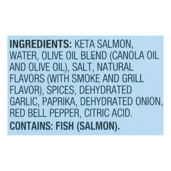 Pink Salmon, Water, Olive Oil Blend (canola Oil And Olive Oil), Salt, Natural Flavors (with Smoke And Grill Flavor), Spices, Dehydrated Garlic, Paprika, Dehydrated Onion, Red Bell Pepper, Citric Acid.