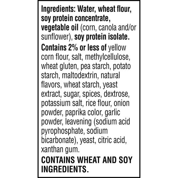 Water, Wheat Flour, Soy Protein Concentrate, Vegetable Oil (corn, Canola And/or Sunflower), Soy Protein Isolate, Contains 2% Or Less Of Yellow Corn Flour, Salt, Methylcellulose, Wheat Gluten, Pea Starch, Potato Starch, Maltodextrin, Natural Flavors, Wheat Starch, Yeast Extract, Sugar, Spices, Dextrose, Potassium Salt, Rice Flour, Onion Powder, Paprika Color, Garlic Powder, Leavening (sodium Acid Pyrophosphate, Sodium Bicarbonate), Yeast, Citric Acid, Xanthan Gum