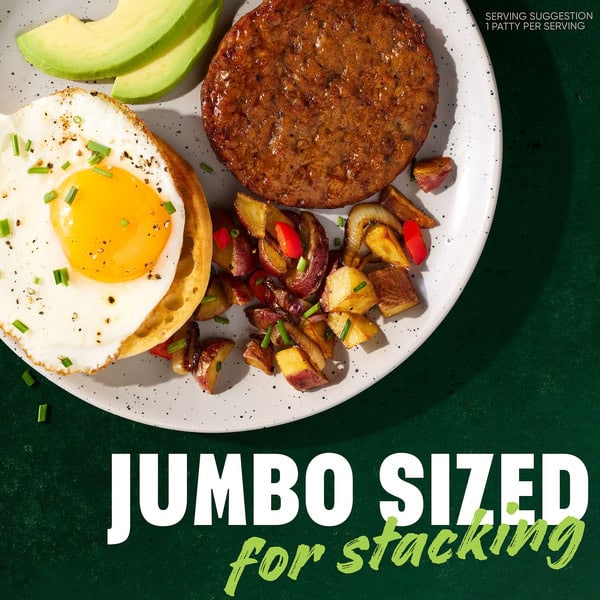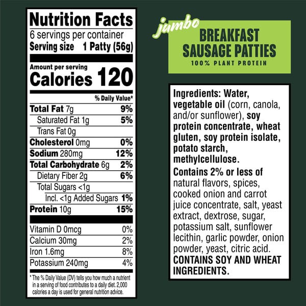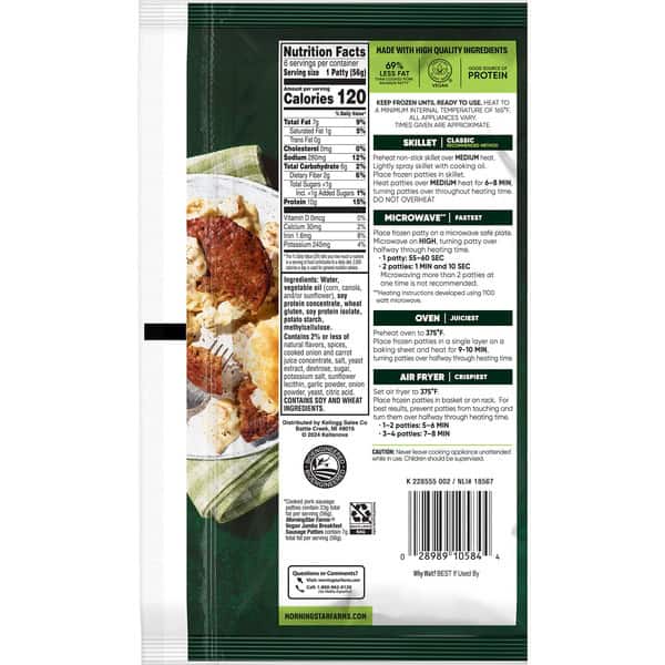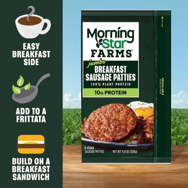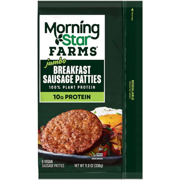 A delicious meat alternative to any balanced breakfast, MorningStar Farms Original jumbo sausage patties are plant-based and seasoned with an inviting blend of aromatic herbs and spices. This convenient, hearty, jumbo-sized breakfast side will delight everyone in your family. With 69% less fat than cooked pork sausage*, MorningStar Farms Original jumbo sausage patties provide a good source of protein (10g per serving, 15% daily value); Whether you’re whipping up a breakfast scramble, a short stack of pancakes, or biscuits with veggie gravy, these savory patties are sure to please vegetarians and meat-lovers alike. Try them in a breakfast sandwich or crumble breakfast sausage into an omelet for a quick breakfast. MorningStar Farms makes it easy to get your plant-based protein any time, it’s good for you and good for the planet. *Cooked pork sausage patties contains 23g total fat per serving (56g). MSF Vegan jumbo breakfast sausage patty contains 7g total fat per serving (56g).