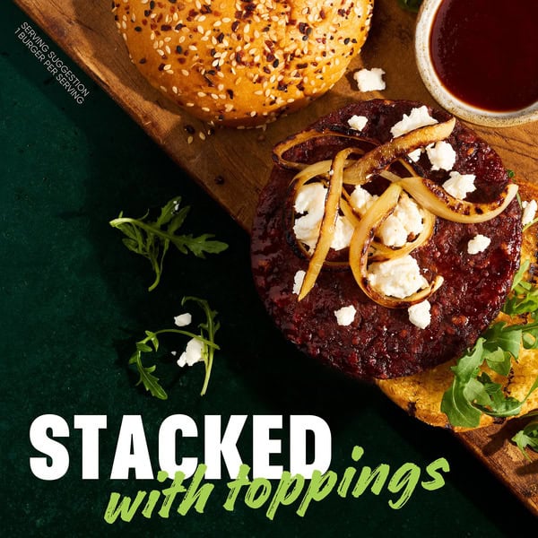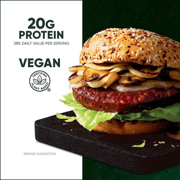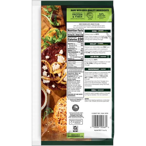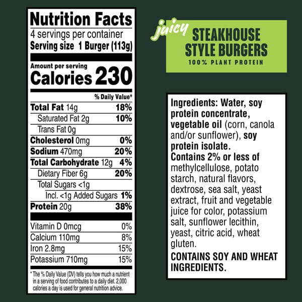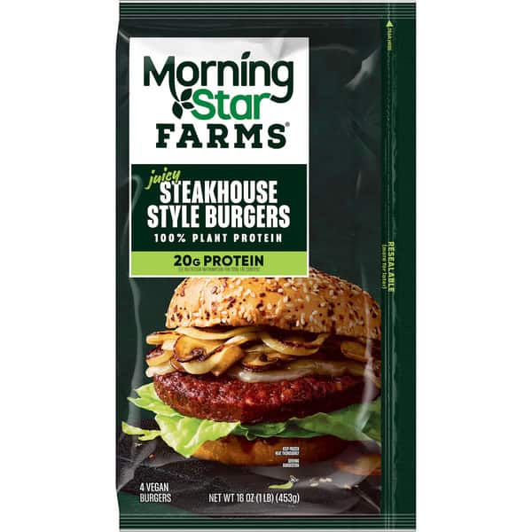 MorningStar Farms Juicy Steakhouse Style burgers with 100% plant protein and feature a classic, restaurant-style taste and juicy texture in every savory bite. Great for the grill and with 42% less fat than cooked ground beef patty*, these veggie burgers provide an excellent source of protein (21g per serving, 39% of daily value, see nutrition information for total fat content). A good source of fiber (Contains 14g total fat per serving), they contain colors and flavors from natural sources; Stock this resealable bag in the freezer for an exciting meat-free addition to any meal anytime. Load up these veggie burgers with your favorites like mushrooms, caramelized onions, vegan cheese or aioli, lettuce, and top with a toasted bun. Top these veggie burgers with a toasted bun. MorningStar Farms Steakhouse Style veggie burgers are a delicious choice sure to please meat-lovers and vegans alike. *Cooked ground beef patty contains 25g total fat per serving (113g). MorningStar Farms Steakhouse Style burger contains 14g total fat per serving (113g).