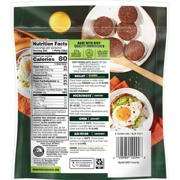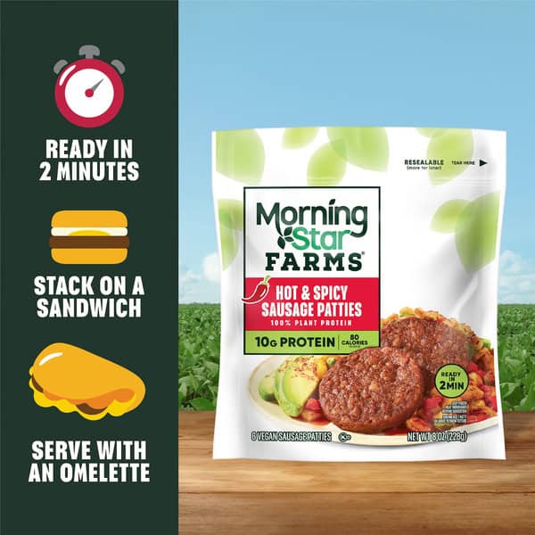MorningStar Farms Hot and Spicy vegan sausage patties are plant-based and seasoned with an inviting blend of aromatic spices to delight everyone in your family. With 77% less fat than cooked pork sausage*, MorningStar Farms Hot and Spicy vegan sausage patties provide a good source of protein (10% of daily value); Whether you’re whipping up a breakfast scramble, a short stack of pancakes, or biscuits with veggie gravy, MorningStar Farms Hot and Spicy sausage patties are sure to please vegans and meat-lovers alike. These vegan sausage patties make a wonderful addition to breakfast sandwiches, too. MorningStar Farms makes it so easy to get your plant-based protein any time of the day. *Cooked pork sausage contains 16g total fat per serving (38g). MorningStar Farms Veggie Hot and Spicy Sausage Patties contain 3.5g total fat per serving (38g).