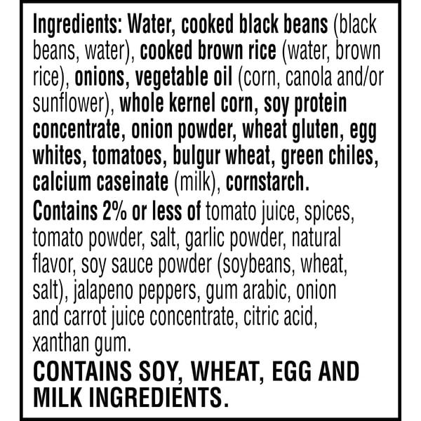 Water, Cooked Black Beans (black Beans, Water), Cooked Brown Rice (water, Brown Rice), Onion, Whole Kernel Corn, Corn Oil, Soy Protein Concentrate, Wheat Gluten, Egg Whites, Diced Tomatoes, Bulgur Wheat, Green Chiles, Calcium Caseinate, Cornstarch, Contains Two Percent Or Less Of Onion Powder, Spices, Tomato Juice, Yeast Extract, Tomato Powder, Dextrose, Salt, Garlic Powder, Hydrolyzed Vegetable Protein (corn Gluten, Wheat Gluten, Soy Protein), Soy Sauce (soybeans, Wheat, Salt), Natural And Artificial Flavors, Paprika, Jalapeno Pepper, Citric Acid, Xanthan Gum, Disodium Inosinate, Thiamin Hydrochloride, Caramel Color, Lactic Acid.