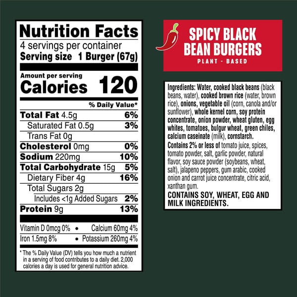 • Includes 1, 9.5oz resealable bag containing 4 MorningStar Farms Spicy Black Bean veggie burgers; SNAP and EBT eligible food item