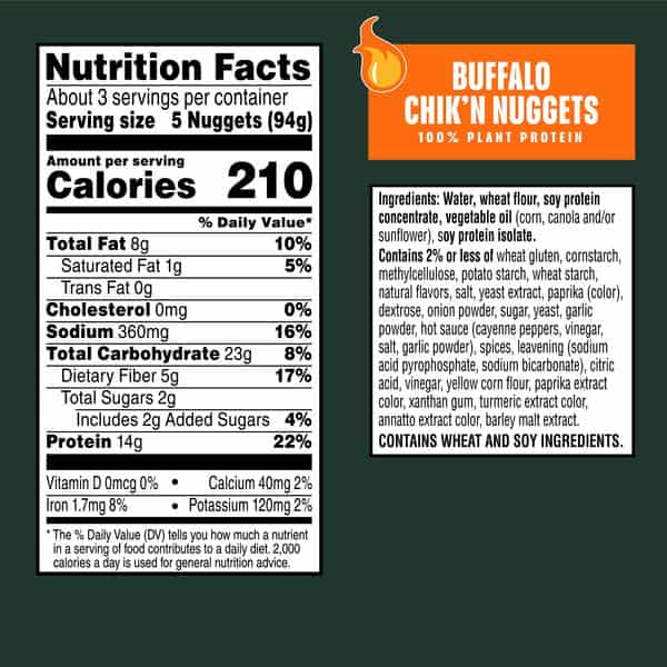 MorningStar Farms Buffalo chik’n nuggets are spicy and buffalo seasoned with a crispy, crunchy breading outside and tender inside. With 42% less fat than regular chicken nuggets*, these wings contain 14g protein (22% of daily value) and a good source of fiber (contains 8g total fat per serving). Stock this resealable bag in the freezer for an exciting anytime meal starter you can pair with your favorite dips, celery, or serve in a wrap; Whether you’re looking for a winning snack to share with friends on game night, or just a quick and convenient lunch or dinner starter, MorningStar Farms Buffalo chik’n nuggets are a delicious choice sure to please meat-lovers and vegetarians alike. *Chicken nuggets contain 14g total fat per serving (94g). MorningStar Farms Buffalo Chik’n Nuggets contain 8g total fat per serving (94g).