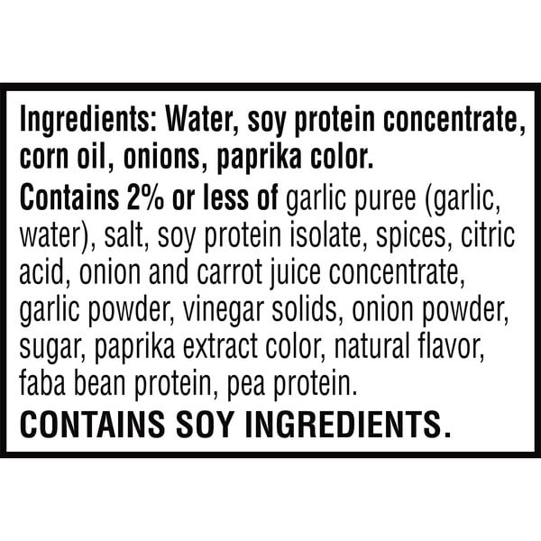 Water, Soy Protein Concentrate, Corn Oil, Onions, Paprika Color, Contains 2% Or Less Of Garlic Puree (garlic, Water), Salt, Soy Protein Isolate, Spices, Citric Acid, Onion And Carrot Juice Concentrate, Garlic Powder, Vinegar Solids, Onion Powder, Sugar, Paprika Extract Color, Natural Flavor, Faba Bean Protein, Pea Protein