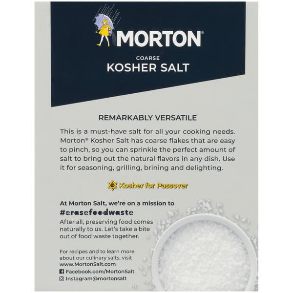 Morton Kosher Salt is a versatile salt loved by chefs for its texture, ease of use, and ability to bring out the natural flavors of food. The coarse flake crystals of Morton Coarse Kosher Salt are much larger than regular table salt crystals, making them easy to pinch for measuring and sprinkling. Morton Kosher Salt is non-iodized salt, Kosher-certified for use in preparing kosher meals, and is great for everyday seasoning and prepping.