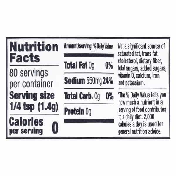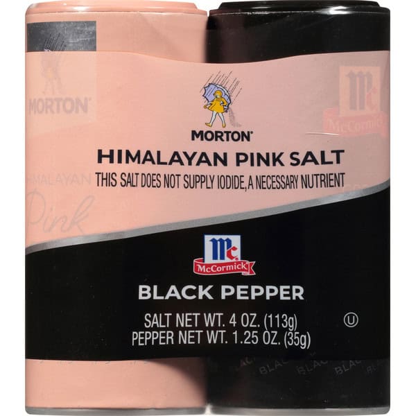 Black pepper contains an insignificant amount of nutrients. For Himalayan pink salt see the nutrition facts. This salt does not supply iodide, a necessary nutrient. Morton pink salt crystals contain natural minerals that add a touch of color and excitement to elevate meals. McCormick ground black pepper adds an earthy kick and sharp aroma. This combination is ideal for seasoning to add flavor to any dish. Helpful Hint: Because Himalayan Pink Salt is all-natural, the sat may cake. Simply shake to separate the crystals. Questions? Call 1-800-789-salt (7258). Salt: Product Of Pakistan.