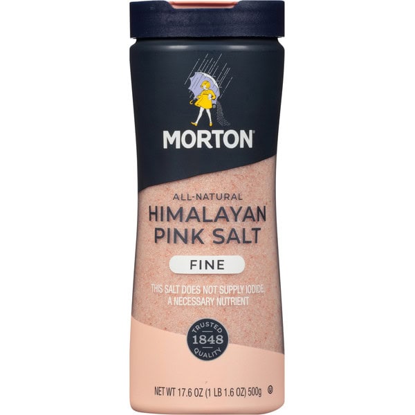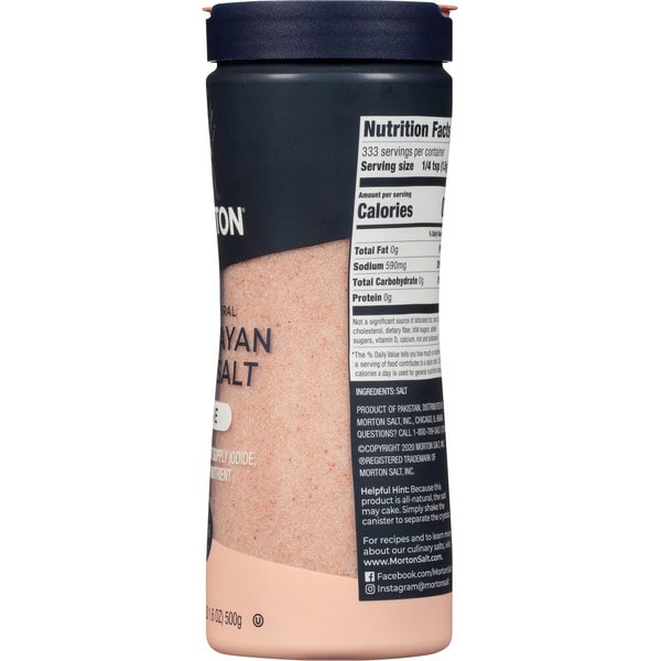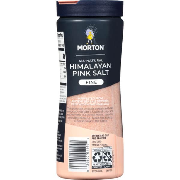 Non-GMO. All-natural. Trusted quality. 1848. This salt does not supply iodide a necessary nutrient. Harvested from ancient sea salt deposits deep within the Himalayas. The Pink Salt crystals contain natural minerals that add a touch of color and excitement to elevate meals. Ideal for everyday cooking, blending, baking or seasoning at the table. Helpful Hint: Because this product is all natural. the salt may cake. Simply shake the canister to separate the crystals. www.mortonsalt.com. how2recycle.info. Facebook. Facebook.com/mortonsalt. Instagram. Instagram(at)mortonsalt. Questions? Call 1-800-789-Salt (7259). For recipes and to learn more about our culinary salts, visit www.mortonsalt.com. Bottle and cap are BPA free. Product of Pakistan.