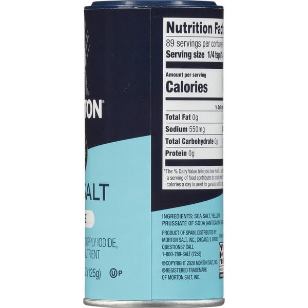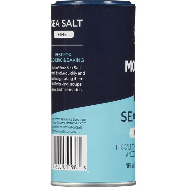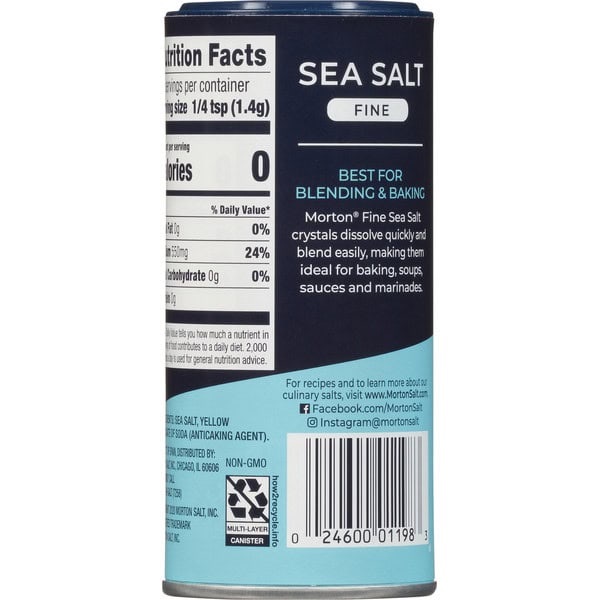 Non-GMO. Trusted quality 1848. This salt does not supply iodide, a necessary nutrient. Best for blending & baking Morton fine sea salt crystals dissolve quickly and blend easily, making them ideal for baking, soups, sauces and marinades. how2recycle.info. www.MortonSalt.com. Facebook. Facebook.com/MortonSalt. Instagram. Instagram@mortonsalt. Questions? Call 1-800-789-SALT (7258). For recipes and to learn more about our culinary salts, visit www.MortonSalt.com. Product of Spain.