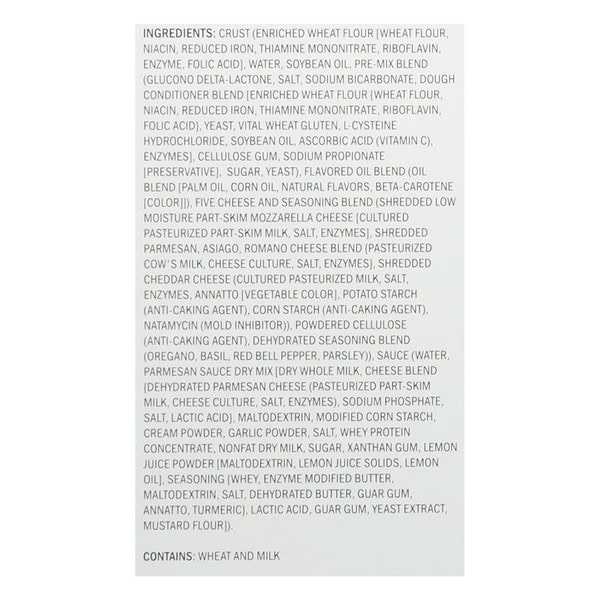 Crust (bleached Enriched Flour (wheat Flour, Niacin, Reduced Iron, Thiamine Mononitrate, Riboflavin, Enzyme, Folic Acid), Water, Soybean Oil, Pre-mix Blend (glucono Delta-lactone, Salt, Sodium Bicarbonate, Dough Conditioner Blend (enriched Wheat Flour {wheat Flour, Niacin, Reduced Iron, Thiamine Mononitrate, Riboflavin, Folic Acid), Yeast, Vital Wheat Gluten, L-cysteine Hydrochloride, Soybean Oil, Ascorbic Acid (vitamin C), Enzymes], Cellulose Gum, Sodium Propionate [preservative], Soybean Oil {processing Aid), Calcium Silicate (processing Aid)), Sugar, Yeast, Flavored Oil Blend (oil Blend (palm Oil, Corn Oil, Natural Flavors, Beta-carotene [color]])), Five Cheese And Seasoning Blend (shredded Low Moisture Part-skim Mozzarella Cheese (cultured Pasteurized Part-skim Milk, Salt, Enzymes], Shredded Parmesan, Asiago, Romano Cheese Blend (pasteurized Cow’s Milk, Cheese Culture, Salt, Enzymes), Shredded Cheddar Cheese (pasteurized Milk, Cheese Cultures, Salt, Enzymes, Annatto [vegetable Color], Powedered Cellulose {anti-caking Agent}), Dehydrated Seasoning Blend (oregano, Basil, Red Bell Pepper, Parsley)), Sauce (water, Parmesan Sauce Dry Mix [dry Whole Milk, Cheese Blend (dehydrated Parmesan Cheese (pasteurized Part-skim Milk, Cheese Culture, Salt, Enzymes), Sodium Phosphate, Salt, Lactic Acid}, Maltodextrin, Modified Corn Starch, Cream Powder, Garlic Powder, Salt, Whey Protein Concentrate, Nonfat Dry Milk, Sugar, Xanthan Gum, Lemon Juice Powder (maltodextrin, Lemon Juice Solids, Lemon Oil), Seasoning (whey, Enzyme Modified Butter, Maltodextrin, Salt, Dehydrated Butter, Guar Gum, Annatto, Turmeric), Lactic Acid, Guar Gum, Yeast Extract, Mustard Flour]).