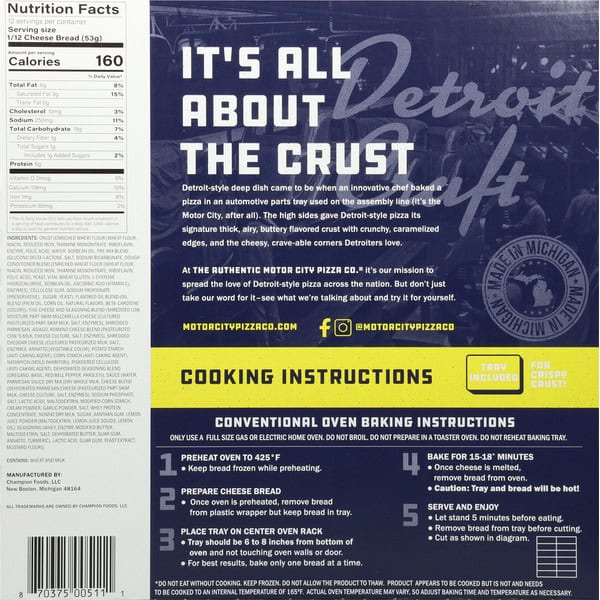 Cooking Instructions: Tray included for crispy crust! conventional Oven Baking Instructions: 1. Preheat oven to 425 degrees F. Keep bread frozen while preheating. 2. Prepare cheese bread. Once oven is preheated, remove bread from plastic wrapper but keep bread in tray. 3. Place tray on center oven rack. Tray should be 6 to 8 inches from bottom of oven and not touching oven walls or door. For best results, bake only one bread at a time. 4. Bake for 15-18 (do not eat without cooking. Keep frozen. Product appears to be cooked but is not and needs to be cooked to internal temperature of 165 degrees F. Actual oven temperature may vary, so adjust baking time and temperature as necessary) minutes. Once cheese is melted, remove bread from oven. Caution: Tray and bread will be hot! 5. Serve and enjoy. Let stand 5 minutes before cutting. Cut as shown in diagram.