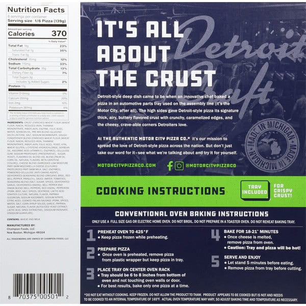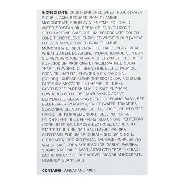 Crust (bleached Enriched Flour [wheat Flour, Niacin, Reduced Iron, Thiamine Mononitrate, Riboflavin, Enzyme, Folic Acid), Water, Soybean Oil, Pre-mix Blend (glucono Delta-lactone, Salt, Sodium Bicarbonate, Dough Conditioner Blend (enriched Wheat Flour (wheat Flour, Niacin, Reduced Iron, Thiamine Mononitrate, Riboflavin, Folic Acid) Yeast, Vital Wheat Gluten, L-cysteine Hydrochloride, Soybean Oil, Ascorbic Acid (vitamin C), Enzymes], Cellulose Gum, Sodium Propionate [preservative], Soybean Oil {processing Aid), Calcium Silicate (processing Aid)), Sugar, Yeast, Flavored Oil Blend (oil Blend [palm Oil, Corn Oil, Natural Flavors, Beta-carotene [color]])), Cheese Blend (shredded Low Moisture Part-skim Mozzarella Cheese [cultured Pasteurized Part-skim Milk, Salt, Enzymes], Powdered Cellulose (anti-caking Agent), Dehydrated Seasoning Blend (oregano, Basil, Red Bell Pepper, Parsley)), Sauce (water, Tomatoes, Seasoning Blend (salt, Sugar, Spices, Dehydrated Garlic, Dehydrated Onion, Soybean Oil (processing Aid}]), Bell Pepper And Onion Blend (bell Peppers, Red Onion), Pepperoni (pork, Beef, Salt, Spices, Dextrose, Lactic Acid Starter Culture, Natural Flavor, Paprika Oleoresin, Sodium Ascorbate, Sodium Nitrite, Citric Acid), Cooked Italian Sausage (pork, Spices, Water, Salt, Corn Syrup Solids, Garlic, Paprika, Sugar, Natural Flavor [autolyzed Yeast Extract, Lactic Acid, Spice Extractive], Disodium Inosinate Disodium Guanylate).