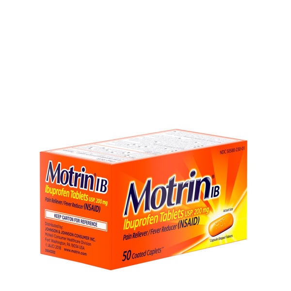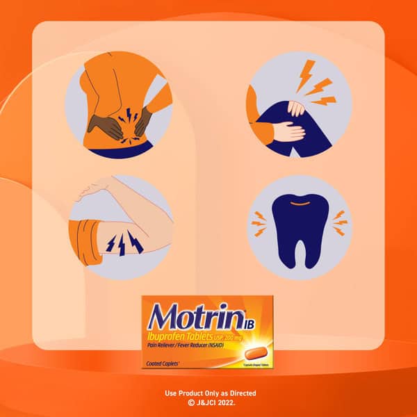 Get relief from minor aches and pains and temporarily reduce fevers with Motrin IB tablets that each contain 200 mg of the NSAID ibuprofen. Safe and effective when used as directed, these ibuprofen tablets work to temporarily reduce fever and relieve minor aches and pains due to the common cold, headache, muscular aches, minor pain of arthritis, toothache, backache, and menstrual cramps. Each Motrin IB tablet contains 200 milligrams of the nonsteroidal anti-inflammatory drug ibuprofen, a pain relief medicine that works fast to stop pain where it starts for powerful, effective relief. Adults and children 12 and older, take one caplet every 4 to 6 hours while symptoms persist; if pain or fever does not respond to one caplet, two caplets may be used. This site contains current product information and may differ from the information on the product packaging you may have.