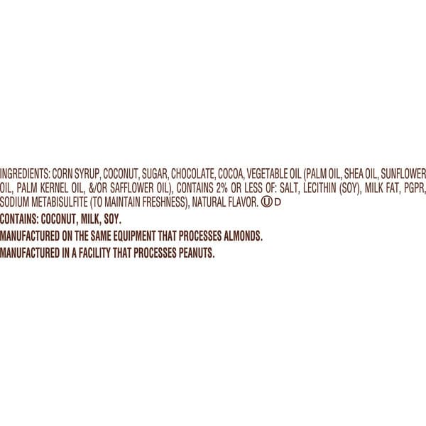 Corn Syrup, Semi-sweet Chocolate (chocolate; Sugar; Cocoa; Milk Fat; Cocoa Butter; Soy Lecithin; Pgpr, Emulsifier); Coconut; Sugar; Salt; Natural And Artificial Flavor; Hydrolyzed Milk Protein; Sodium Metabisulfite And Sulfur Dioxide,to Maintain Freshness; Caramel Color; Milk.