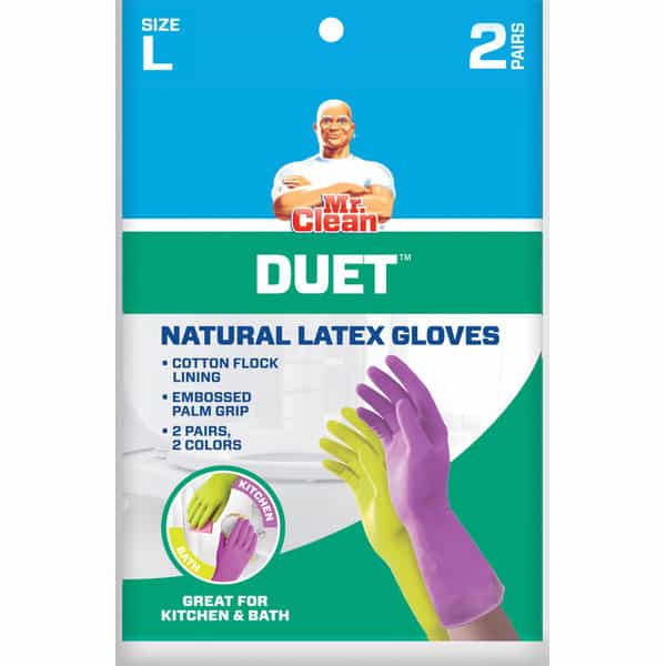 Mr. Clean Duet gloves are made from a high quality natural rubber latex material. Two different colored pairs of gloves make it easy to use one pair in the kitchen and another in the bathroom. Extremely flexible and tear resistant, these cotton flock lined gloves offer ideal everyday protection for household chores. The 12 length and 16 mil. thickness provides plenty of protection, while still allowing superior dexterity.