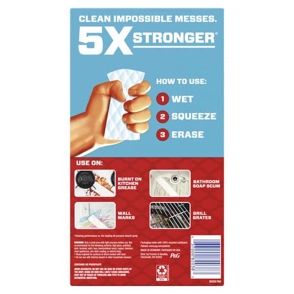 Mr. Clean Magic Eraser Extra Durable all purpose cleaner requires 80% less scrubbing* and is perfect for tough messes**. This eraser sponge has cleaning micro-scrubbers that reach into surface grooves, lifting away built up dirt and grime. Use it all around the house as a textured multi surface cleaner on your impossible messes: marks on walls, soap scum in your bath tub and on your shower glass, & greasy kitchen messes on counters, stovetops, and ovens! Great as a sneaker cleaner! Add Mr. Clean Magic Eraser Extra Durable to your arsenal of cleaning supplies today.*cleaning performance vs. the leading all-purpose bleach spray **visit mrclean.com/messes for a full list