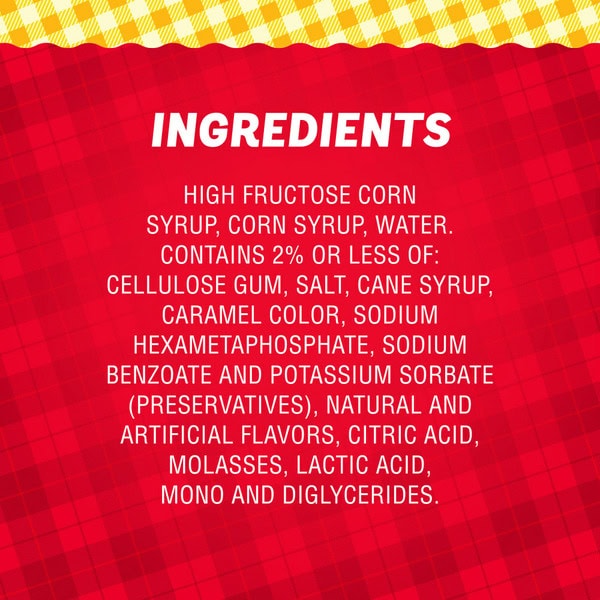 High Fructose Corn Syrup, Corn Syrup, Water. Contains 2% Or Less Of: Cellulose Gum, Salt, Cane Syrup, Caramel Color, Sodium Hexametaphosphate, Sodium Benzoate And Potassium Sorbate (preservatives), Natural And Artificial Flavors, Citric Acid, Molasses, Lactic Acid, Mono And Diglycerides.