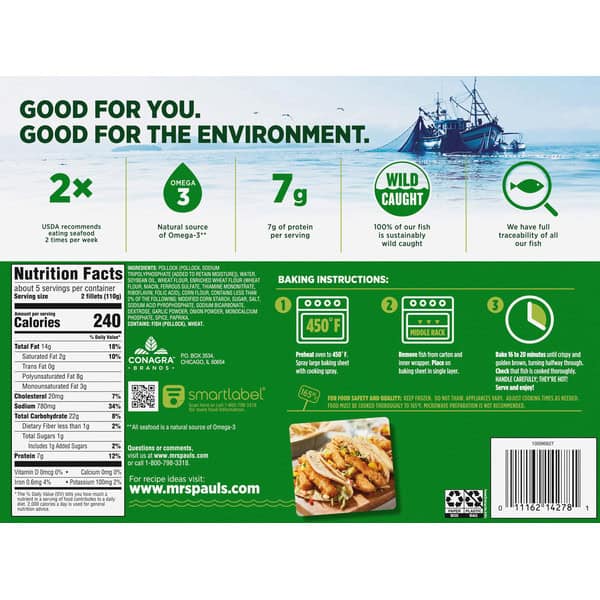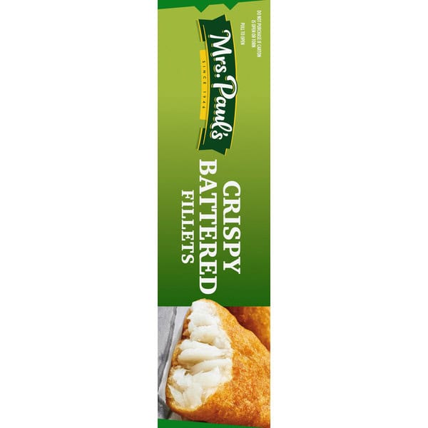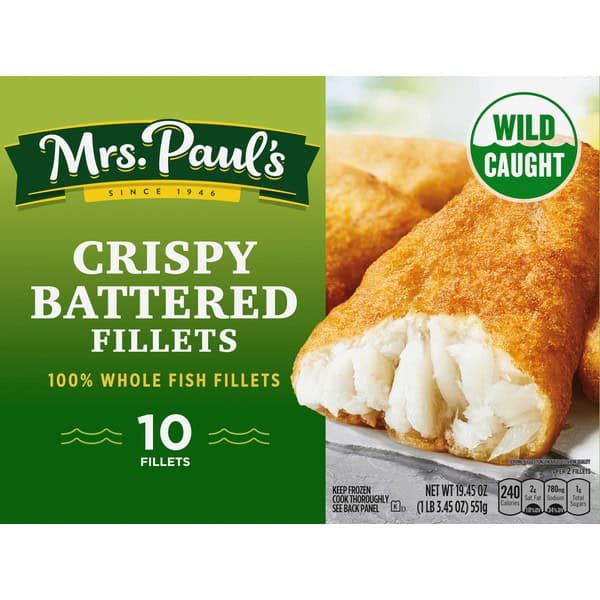 When you want delicious, crispy fish fillets, reach for Mrs. Paul’s Crispy Battered 100% Whole Fish Fillets. This mouthwatering, wild-caught pollock is surrounded by a golden breading made from crunchy panko breadcrumbs that is the perfect combination of flavor and crispiness. Whether you are adding them to your favorite fish taco recipe, drenching them in tartar sauce or simply eating them all by themselves, you will love these tasty fish fillets. They are also a good source of omega-3s, so you can feel good about the seafood you’re eating. Mrs. Paul’s: made with 100% real fish and never any fillers.