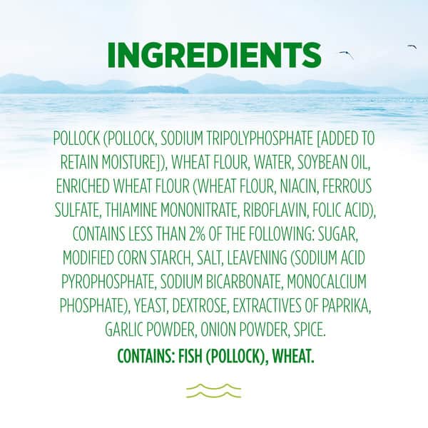 Pollock (fish, Sodium Tripolyphosphate To Retain Fish Moisture), Bread Crumbs (unbleached Wheat Flour, Sugar, Salt And Yeast), Water, Cottonseed Oil And/or Soybean Oil, Wheat Flour. Contains 2% Or Less Of: Enriched Wheat Flour (wheat Flour [enriched With Niacin, Ferrous Sulfate, Thiamine Mononitrate, Riboflavin, Folic Acid], Salt, Soybean Oil), Modified Food Starch, Salt, Sugar, Leavening (sodium Acid Pyrophosphate, Sodium Bicarbonate, Monocalcium Phosphate), Dextrose, Garlic Powder, Onion Powder, Natural Flavors, Paprika.