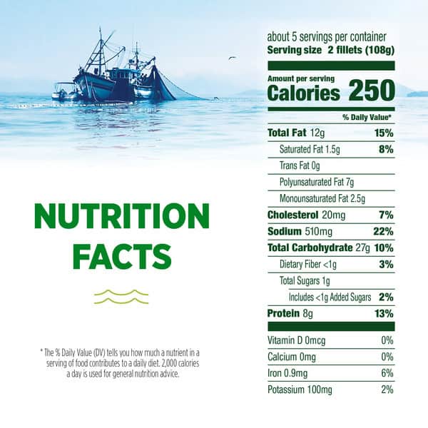 Cook thoroughly. See back panel. Conventional Oven: (1) Preheat oven to 450 degrees F. spray large baking sheet with cooking sheet with cooking spray. (2) Remove fish from carton and inner wrapper. Place on baking sheet in single layer. (3) Bake 18 to 22 minutes until crispy and golden brown, through cooking time. Check that fish is cooked thoroughly. Handle carefully; They’re hot! Serve and enjoy! Countertop Air Fryer: (1) Arrange single layer of fish on bottom of fryer basket or rack. (2) Cook at 400 degrees F for 12 to 14 minutes until crispy and golden brown. For more even browning, turn halfway through cooking time. (3) Check that fish is cooked thoroughly. Handle carefully; They’re hot! Serve and enjoy. For food safety and quality: Keep frozen. Do not thaw. Appliances vary. Adjust cooking times as needed. Food must be cooked thoroughly to 165 degrees F. microwave preparations is not recommended.