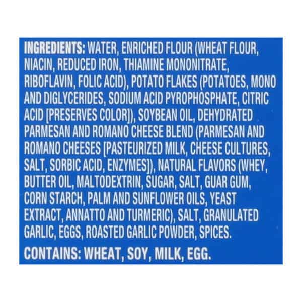 Water, Enriched Flour (wheat Flour, Niacin, Reduced Iron, Thiamine Mononitrate, Riboflavin, Folic Acid), Potato Flakes (potatoes, Mono And Diglycerides, Sodium Acid Pyrophosphate, Citric Acid [preserves Color), Soybean Oil, Dehydrated Parmesan And Romano Cheese Blend (parmesan And Romano Cheeses [pasteurized Milk, Cheese Cultures, Salt, Sorbic Acid, Enzymes]), Natural Flavors (whey, Butter Oil, Maltodextrin, Sugar, Salt, Guar Gum, Corn Starch, Palm And Sunflower Oils, Yeast Extract, Annatto And Turmeric), Salt, Granulated Garlic, Eggs, Roasted Garlic Powder, Spices