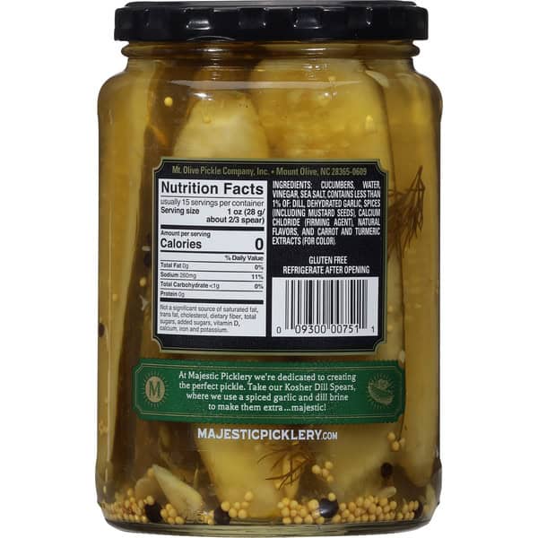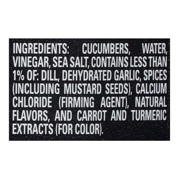 Cucumbers, Water, Vinegar, Sea Salt, Contains Less Than 1% Of: Dill, Dehydrated Garlic, Spices (including Mustard Seeds), Calcium Chloride (firming Agent), Natural Flavors, And Carrot And Turmeric Extracts (for Color).