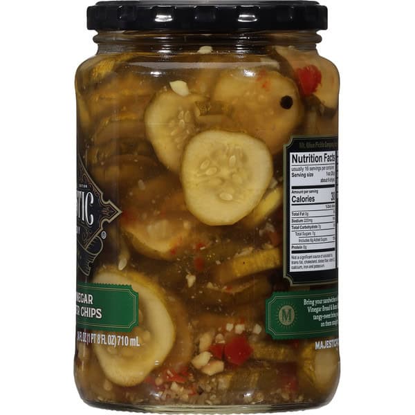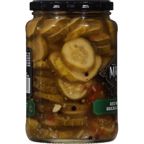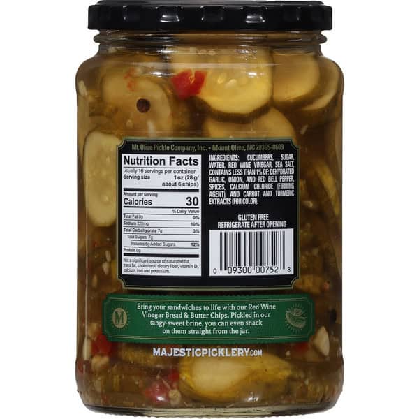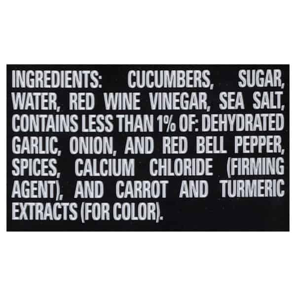 Cucumbers, Sugar, Water, Red Wine Vinegar, Sea Salt, Contains Less than 1% of: Dehydrated Garlic, Onion, and Red Bell Pepper, Spices, Calcium Chloride (Firming Agent), and Carrot and Turmeric Extracts (for Color).