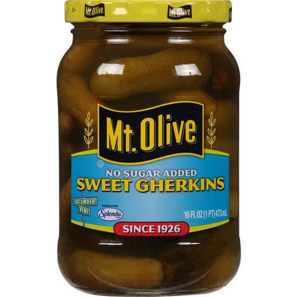 • One 16 fl oz jar of Mt. Olive No Sugar Added Sweet Gherkin Pickles