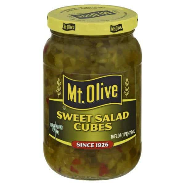 If you love the easy to spread, amazing taste of our Sweet Relish but want even more bold flavor and big crunch, then Mt. Olive’s 16 oz Jar of Sweet Salad Cubes are the perfect addition to your meals. Mt. Olive’s salad cubes are made with a larger cut than relish, giving them a crunchier texture. If you love scooping up potato salad or deviled eggs and getting that amazing pickled crunch, you’ll love our Sweet Salad Cubes. Add a little zing to any meal or appetizer with the sweet and tangy flavor that has been brought to life by our proprietary recipe. Once at the peak of ripeness, our cucumbers are pickled and packed in a delicious brine giving you an explosion of crunchy, crisp flavors. Add a new dimension of flavors to every meal, and feel guilt-free from this low carb, gluten-free, and low calorie snack. Already diced to the perfect size, you don’t have to worry about the mess of chopping up pickles and can just scoop into our Sweet Salad Cubes and add them to any easy-to-make recipe. Mt. Olive has been producing high-quality pickled products and relishes for nearly 100 years. Our classic pickled products like the Bread and Butter pickles and the Organic Kosher Dill Pickle Spears have come to be a best selling and well-loved item, overshining those of other pickle companies. Ready to try it for yourself? Give our Sweet Salad Cubes a try!