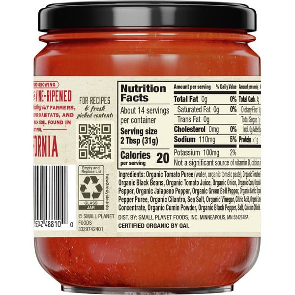 Organic Tomato Puree (water, Organic Tomato Paste), Organic Tomatoes, Rehydrated Organic Black Beans, Organic Onion, Organic Corn, Organic Tomato Juice, Organic Anaheim Pepper, Organic Jalapeno Peppers, Organic Green Pepper, Organic Lime Juice, Organic Garlic, Organic Jalapeno Pepper Puree, Organic Cilantro, Sea Salt, Organic Vinegar, Citric Acid, Organic Cumin Powder, Calcium Chloride, Organic Black Pepper.