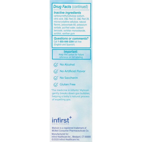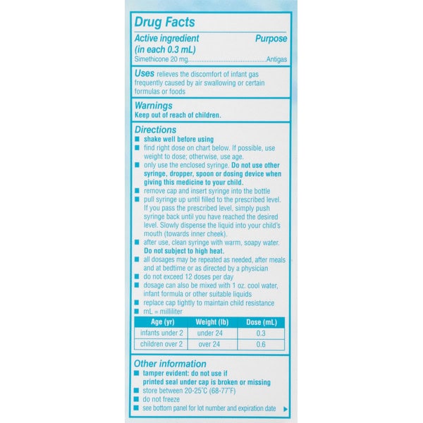 In Each 0.3 ml: Directions: Shake well before using. Find right dose on chart below. If possible, use weight to dose; otherwise, use age. Only use the enclosed syringe. Do not use other syringe, dropper, spoon or dosing device when giving this medicine to your child. Remove cap and insert syringe into the bottle. Pull syringe up until filled to the prescribed level. If you pass the prescribed level, simply push syringe back until you have reached the desired level. Slowly dispense the liquid into your child’s mouth (towards inner cheek). After use, clean syringe with warm, soapy water. Do not subject to high heat. All dosages may be repeated as needed, after meals and at bedtime or as directed by a physician. Do not exceed 12 doses per day. Dosage can also be mixed with 1 oz. cool water, infant formula or other suitable liquids. Replace cap tightly to maintain child resistance. mL = milliliter. Important: Keep this carton for future reference on full labeling. Infants Under 2 Yr (Under 24 lb):: Dose: 0.3 ml. Children Over 2 Yr (Over 24 lb):: Dose: 0.6 ml.