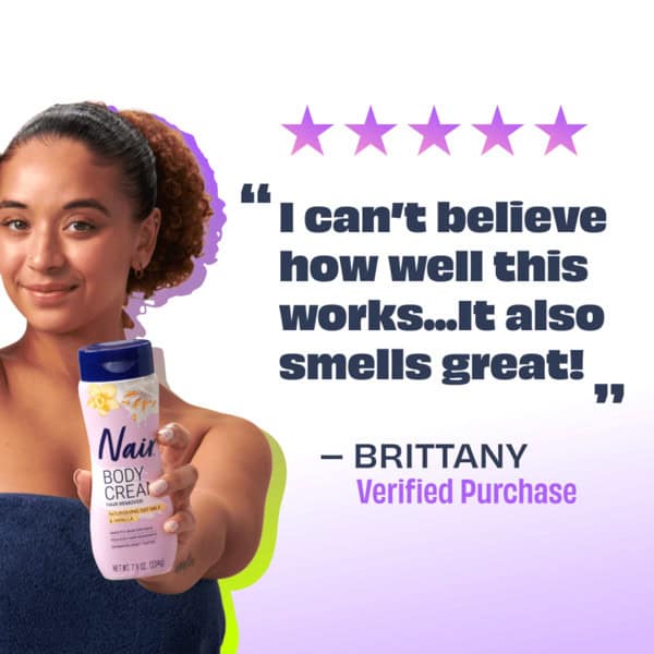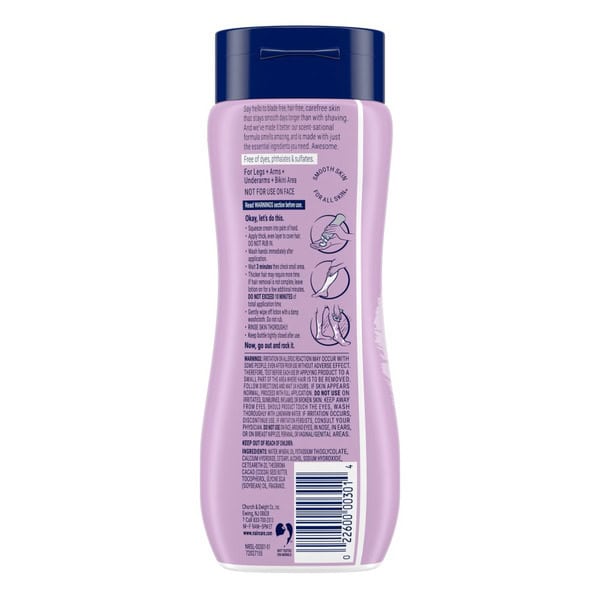 The new Nair experience! Say hello to blade-free, hair-free, carefree skin that stays smooth days longer than shaving. And we’ve made it better: our new and improved Scent-sational scented formula smells amazing! This new fragrance technology uses natural extracts that blend notes of fresh rose and lily of the valley with hints of creamy coconut and light musk to leave skin feeling nourished and pampered. With only the essential ingredients you need including Cocoa Butter and Vitamin E, Nair body cream is now free of dyes, parabens, phthalates and sulfates. Fast and easy, this hair removal cream thoroughly removes body hair below the skin’s surface for painless hair removal. Nair body and leg hair remover cream can be used on the legs, arms, underarms and bikini area, but it is not formulated for use on the face. Trusted since its introduction in 1940, Nair has always been a leader in hair removal. Always patch test before use (see instructions).