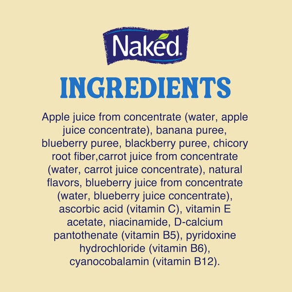 Apple Juice From Concentrate (water, Apple Juice Concentrate), Banana Puree†, Blueberry Puree, Carrot Juice From Concentrate (water, Carrot Juice Concentrate), Chicory Root Fiber, Natural Flavor, Blueberry Juice From Concentrate (water, Blueberry Juice Concentrate), Ascorbic Acid (vitamin C), Vitamin E Acetate, Niacinamide, D-calcium Pantothenate (vitamin B5), Pyridoxine Hydrochloride (vitamin B6), Cyanocobalamin (vitamin B12), †rainforest Alliance Certified™
