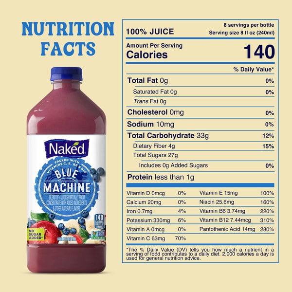 Made from real fruit juices and purees and with no added sugar,* Blue Machine is a great-tasting way to help fuel your daily adventures. It’s masterfully crafted from the perfect blend of apple, blueberry, banana, and other quality ingredients. Whether it’s for starting your day, recharging after a busy afternoon or for your family on the way to school, it’s a great taste that keeps on going thanks to the big 64 fl oz bottle.