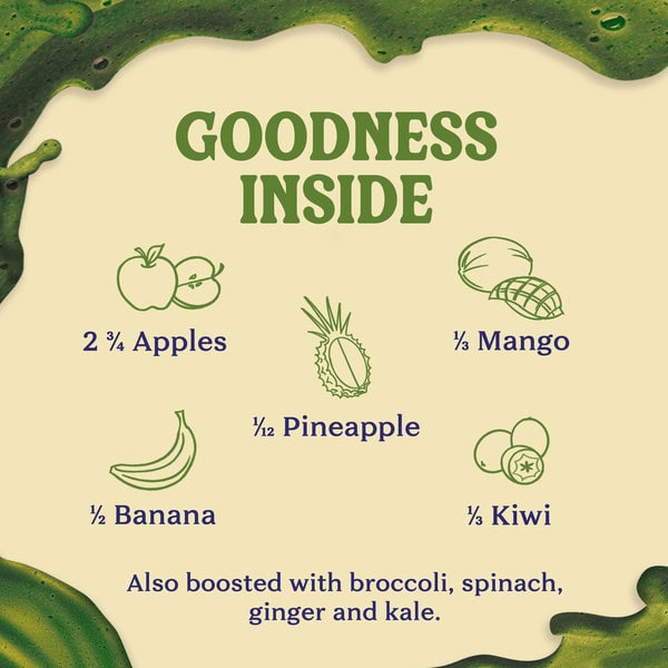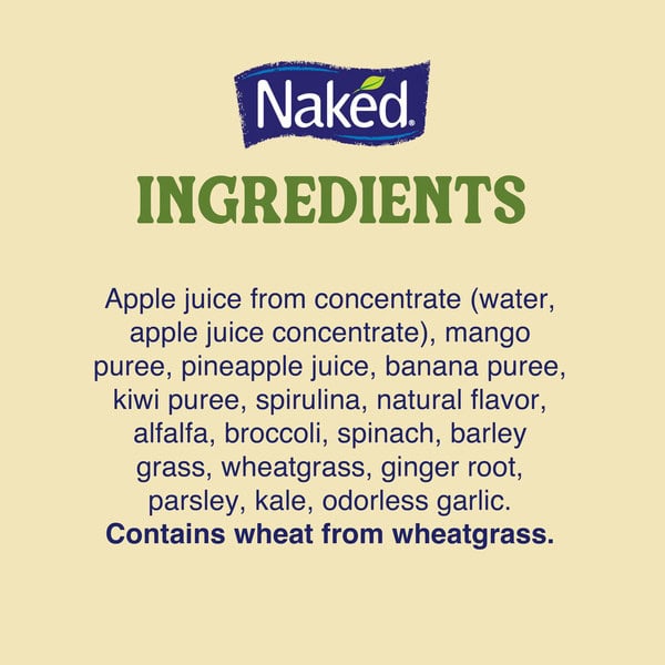 Apple Juice From Concentrate (water, Apple Juice Concentrate), Mango Puree, Pineapple Juice, Banana Puree, Kiwi Puree, Spirulina, Natural Flavor, Alfalfa, Broccoli, Spinach, Barley Grass, Wheatgrass, Ginger Root, Parsley, Kale, Odorless Garlic.